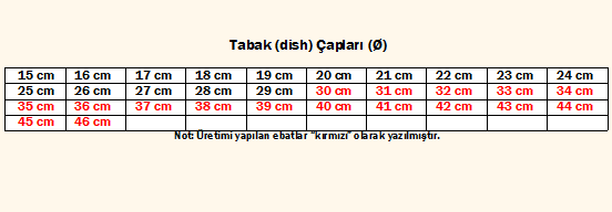 enleri 3.3 cm ile 6 cm arasında değişir. Tabak yükseklikleri ise, 8.2 cm. kadar çıkar. Bu